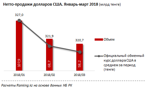 В свою очередь, в этом году тенге укреплялся к доллару в среднем три месяца подряд. В январе один доллар стоил 327 тенге, в феврале - 321,9 тенге, в марте - 320,7 тенге. Вместе с курсом уменьшался и объем нетто-продаж долларов обменными пунктами, говорится в исследовании. В январе объем нетто-продаж составил 107,9 миллиарда тенге, в феврале уменьшился до 68,7 миллиарда тенге, в марте - до 58,2 миллиарда тенге.