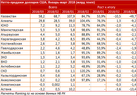 В марте 2018 года в двух из 16 регионов РК казахстанцы сдали больше долларов в обменники, чем выкупили, в то время как в январе и феврале нетто-продажи перевешивали в пользу долларов во всех регионах.
