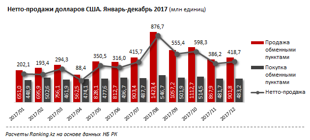 По данным аналитиков, в 2017 году казахстанцы купили в обменных пунктах 10,6 миллиарда долларов, а сдали 5,9 миллиарда долларов. Нетто-продажи (продажа валюты обменными пунктами минус покупка) составили 4,7 миллиарда долларов.