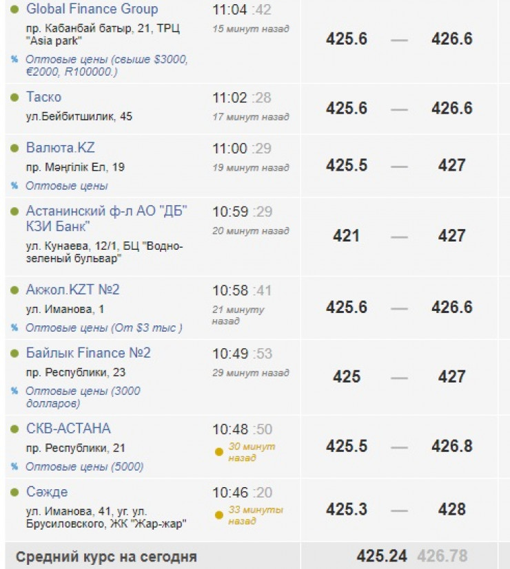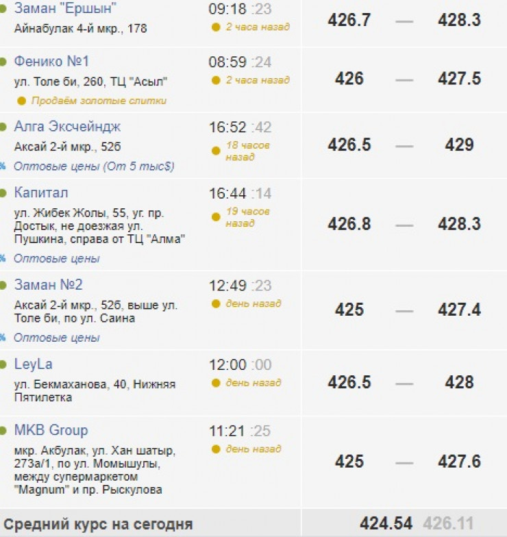 По данным портала Kurs.kz, в обменниках Алматы доллар продают по 425,7-429 тенге, а покупают по 421-426,8 тенге.