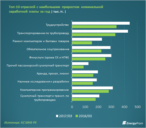 В тройке лидеров по приросту номинальной оплаты труда также предприятия, занимающиеся транспортировкой по трубопроводам, где работникам в текущем году стали платить на 95,4 тысячи тенге больше (или на 29 процентов), чем год назад; и организации, занимающиеся ремонтом компьютеров и бытовых товаров, где зарплаты выросли за год на 77 тысяч тенге (или на 51 процент).