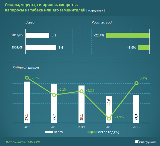 За январь-май было произведено лишь 5,1 миллиарда штук сигарет и прочих табачных изделий (22 процента). Для сравнения, показатели января-мая 2016 года демонстрировали годовое снижение к аналогичному периоду 2015 года на 5,9 процента.