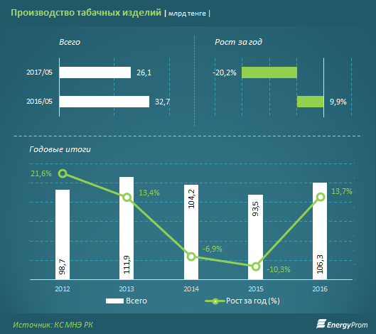 Спад наблюдается и в денежном выражении - так, за январь-май объемы производства табачных изделий составили 26,06 миллиарда тенге, на 20,2 процента меньше, чем в аналогичном периоде годом ранее.