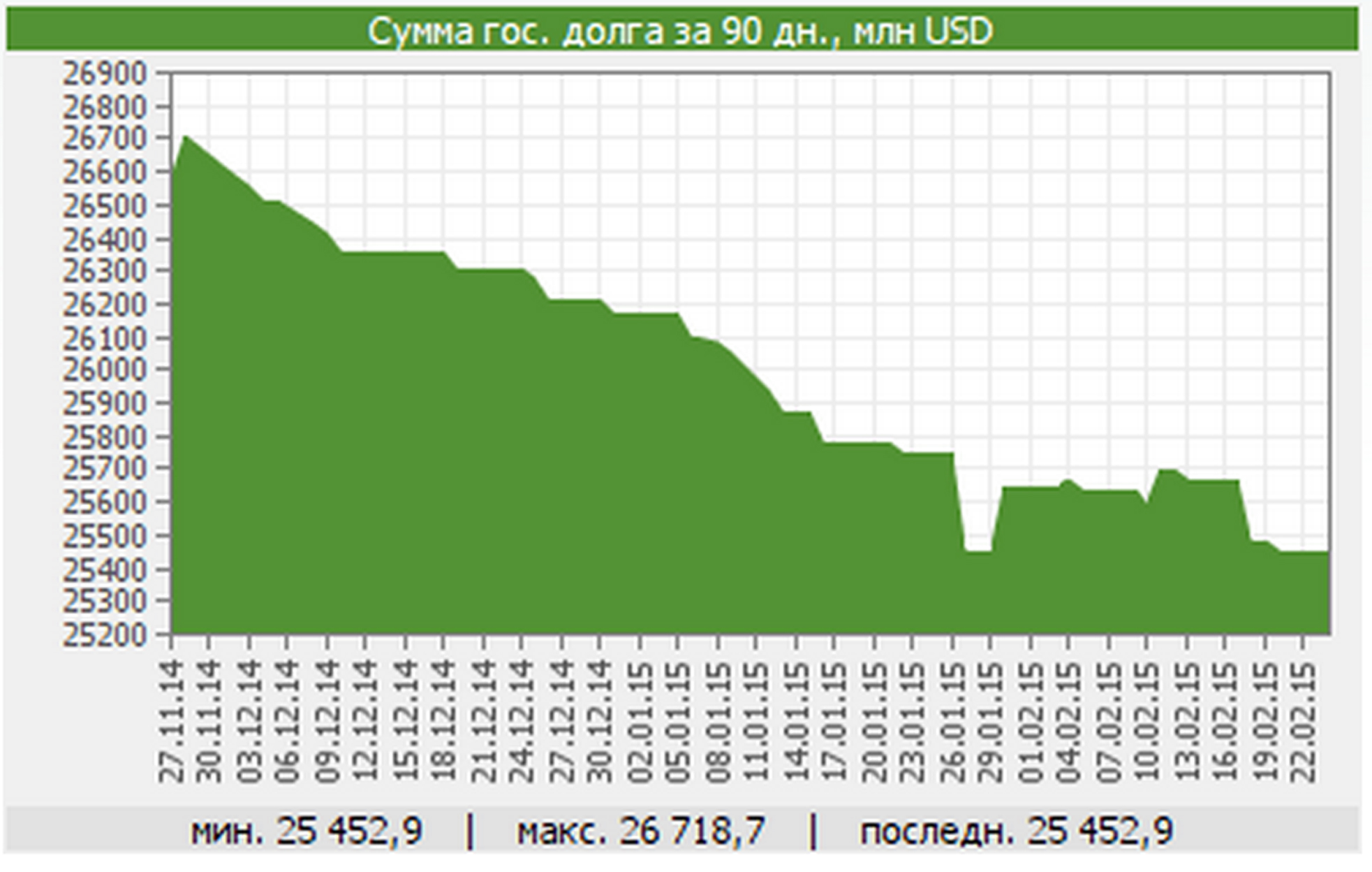 Согласно данным биржи, по состоянию на 25 февраля сумма госдолга Казахстана, выпущенного в виде ГЦБ, достигла 25,4 миллиарда долларов (4,71 триллиона тенге). Для сравнения, сумма госдолга в конце ноября 2014 года составляла 26,7 миллиарда долларов (4,9 триллиона тенге). Как пояснили на бирже, такое резкое снижение суммы госдолга, выпущенного в виде ГЦБ, связано только с тем, что государство в этот период частично погасило задолженность по государственным облигациям.
