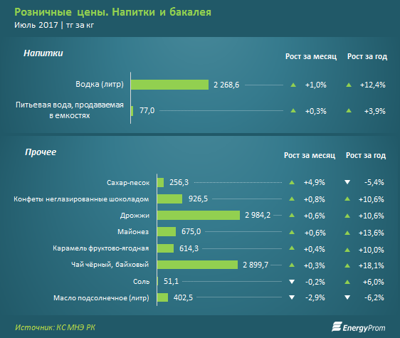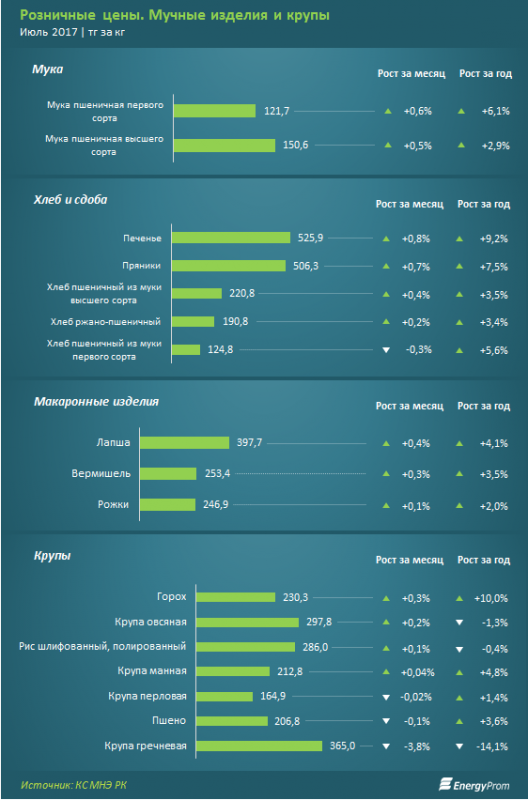 Исследователи отмечают, что хотя по итогам прошлого месяца, июня, инфляция составляла 7,5 процента за год и все еще оставалась в пределе коридора, назначенного Нацбанком (менее 8 процентов), продовольственные товары показали годовой рост цен почти на 10 процентов. Более того, глава Нацбанка допускает, что инфляция может выйти за верхний предел коридора (то есть будет выше 8 процентов) и шоковые предложения на рынке продовольственных товаров будут продолжаться.