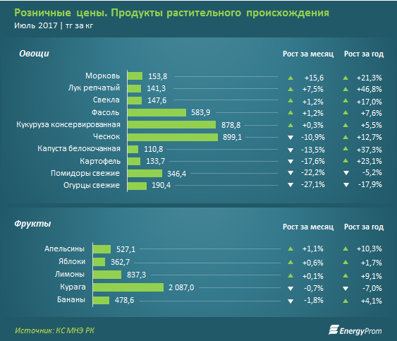 В июле, несмотря на новый урожай, на розничном рынке вновь наблюдается рост цен на морковь (15,6 процента) за месяц, до 153,8 тенге за килограмм, лук - на 7,5 процента, до 141,3 тенге за килограмм, свеклу и фасоль - на 1,2 процента, до 147,6 и 583,9 тенге за килограмм соответственно.