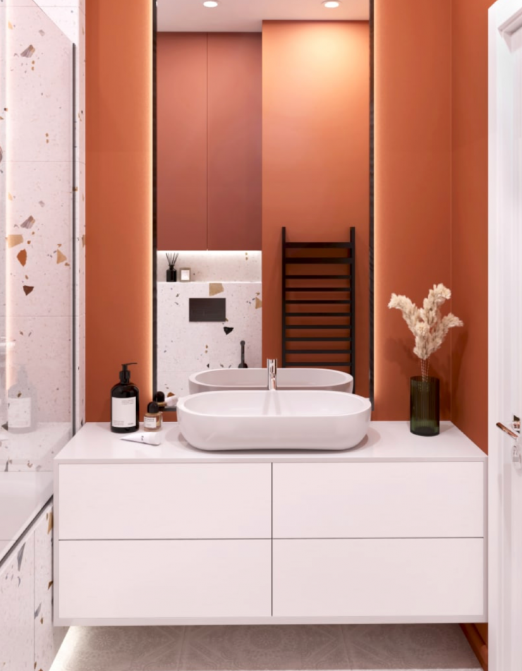 По словам дизайнера, одним из самых затратных пунктов в ремонте является отделка уборных комнат. "На самом деле туалетная зона – это не влажная зона, и кафель там не требуется. Современным решением является отделка наполовину. Так, водопроницаемая зона может состоять из плитки, а остальная часть - из краски или других материалов", - отмечает эксперт. К слову, белый глянец сантехкерамики лучше подчеркнут акцентные стены.