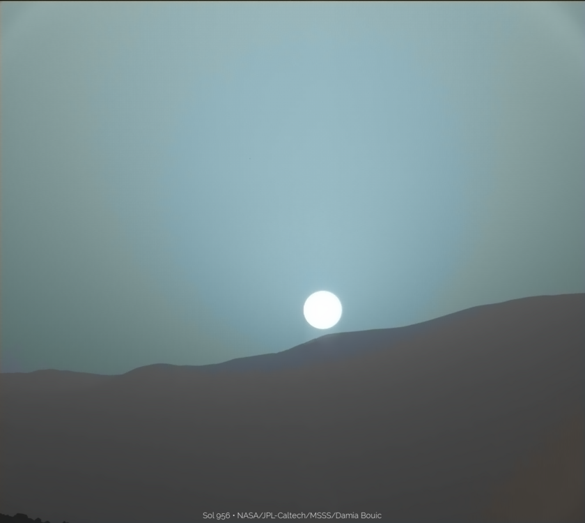 Как видно на снимках, на Марсе, когда светило уходит за горизонт или восходит, в небе появляются оттенки голубого и синего цветов, в отличие от нашей планеты, где небо окрашивается в оранжевый или красный цвета. Это связано с тем, что в атмосфере Марса в большом количестве присутствует пыль, которая лучше рассеивает именно синий спектр солнечного цвета.