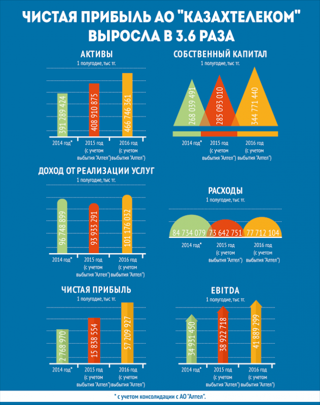 В первом полугодии 2016 года чистая прибыль "Казахтелекома" достигла отметки в 57,2 миллиарда тенге. По сравнению с аналогичным периодом 2015 года (15,8 миллиарда тенге) данный показатель вырос в 3,6 раза.