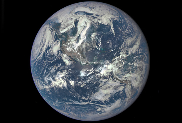 На снимке видно Западное полушарие Земли, в частности Северная и Южная Америки и окружающие их Тихий и Атлантический океаны. В его центре заметны бирюзовые пятна, отвечающие мелководным морям вокруг островов Карибского бассейна. Изображение получено монтированием трех высококачественных снимков, полученных 6 июля 2015 года с расстояния около 1,6 миллиона километров от планеты камерой EPIC (Earth Polychromatic Imaging Camera) аппарата DSCOVR.