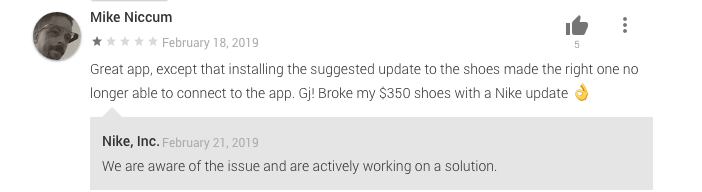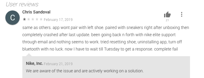 С похожими проблемами столкнулись и другие пользователи. Представители Nike в Google Play ответили, что знают о проблеме и пытаются ее решить.