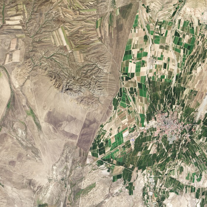 На фотографии, сделанной спутником Landsat-8 в сентябре 2013 года, показан Восточный Казахстан в районе озера Балхаш и Северо-Западный Китай в окрестностях города Тачэн. Если с казахстанской стороны видна в основном пустыня, то успехи китайской ирригации заметны даже из космоса, пишет автор блога Илья Кабанов.
