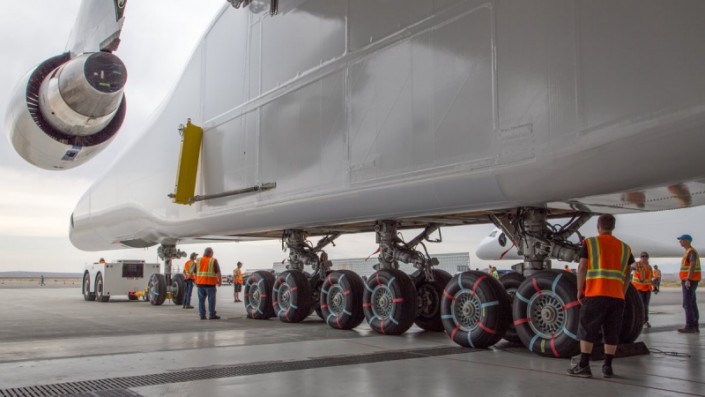 Всего у самолета 28 колес и шесть реактивных двигателей. Масса самолета составляет 250 тонн, а при полной загрузке - 590 тонн. Ракеты для доставки на орбиту небольших спутников будут крепиться к нижней части самолета.