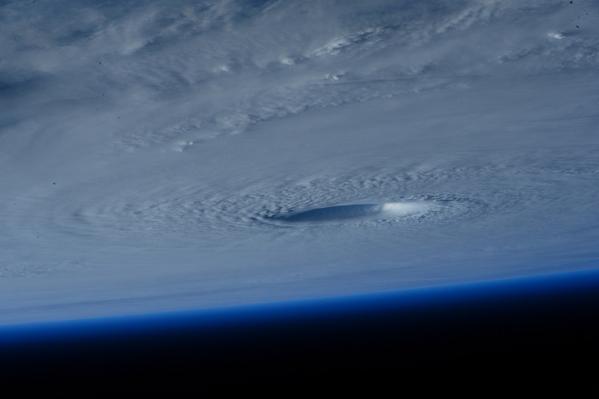 Итальянской астронавтке удалось запечатлеть эпицентр тайфуна - так называемый глаз, окруженный сильнейшими порывами ветра и дождем.