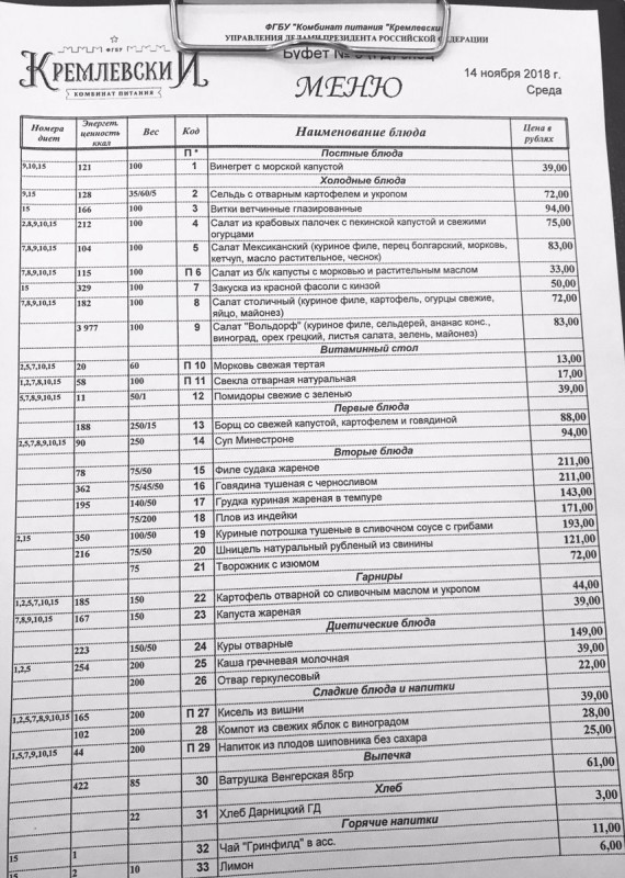Депутат опубликовал меню с ценами в столовой Госдумы