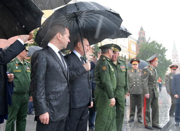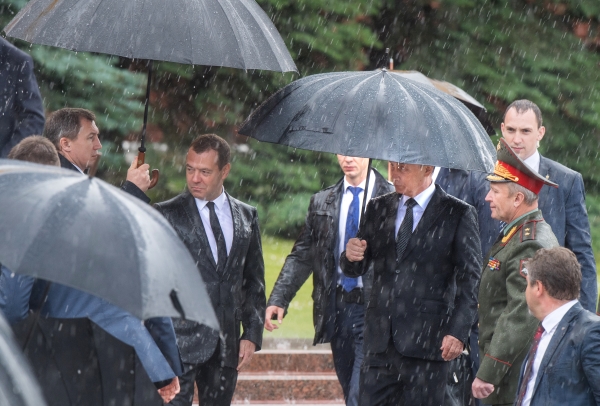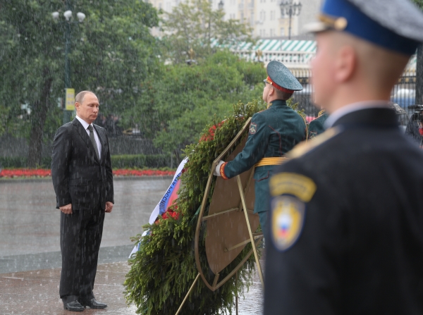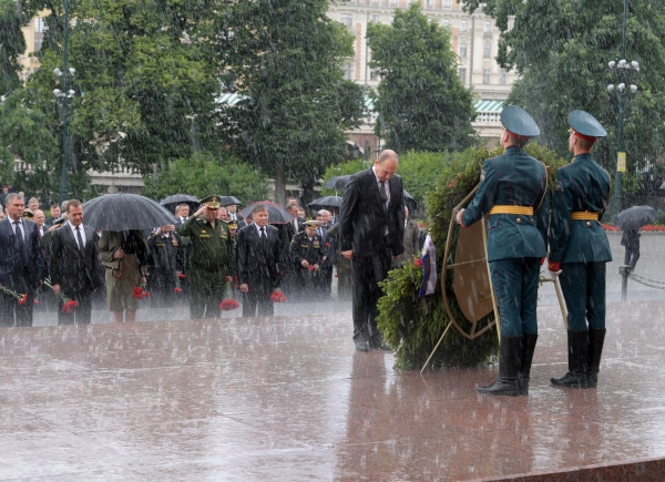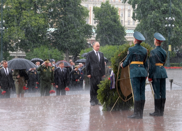 22 июня президент России Владимир Путин возложил венок к Могиле Неизвестного Солдата. Торжественная церемония прошла под проливным дождем, причем глава государства принял участие в ней без зонта и куртки.