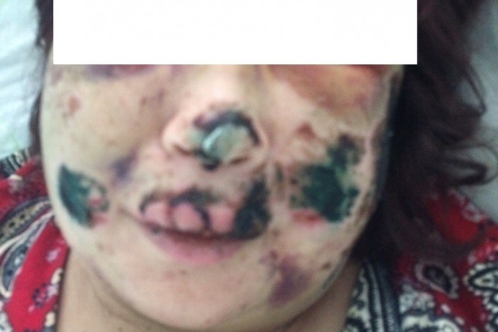 У пострадавшей кусаные раны по всему телу, закрытая черепно-мозговая травма, сотрясение головного мозга, перелом ребра, также откушены уши и прокушен нос