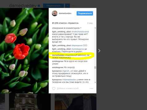 Между тем сам премьер-министр России Дмитрий Медведев на своей странице в Instagram ответил пользователю, чем был занят в день массовых митингов. На вопрос комментатора под ником ispiridonoff: "Привет! Как день?", глава правительства ответил: "Неплохо, на лыжах покатался", а в конце сообщения поставил смайлик с высунутым языком, пишет "Московский комсомолец".