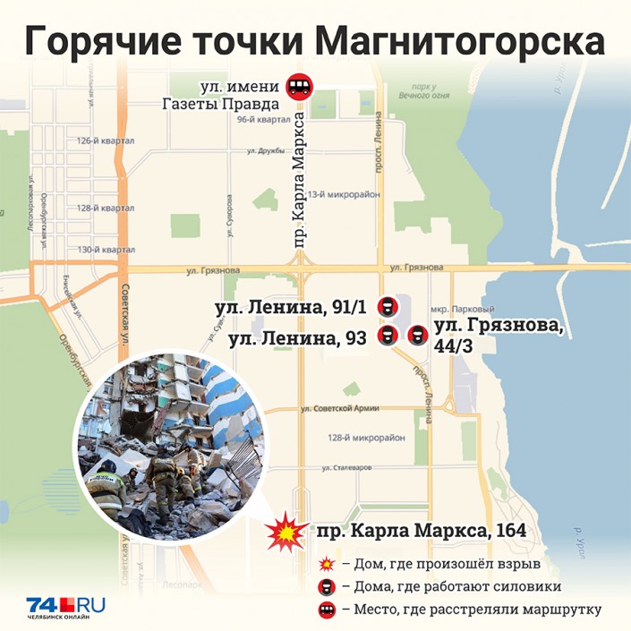 Рано утром 31 декабря в Магнитогорске, по предварительным данным, в результате взрыва бытового газа произошло обрушение одного из подъездов десятиэтажного жилого дома по адресу: проспект Карла Маркса, дом 164. В зоне обрушения проживали 120 человек. В результате трагедии, по последним данным, погибли девять человек. Местонахождение 32 человек пока остается неизвестным.