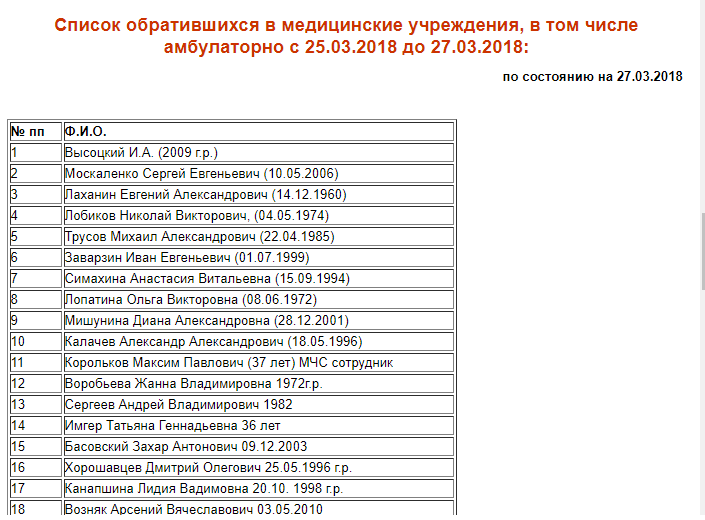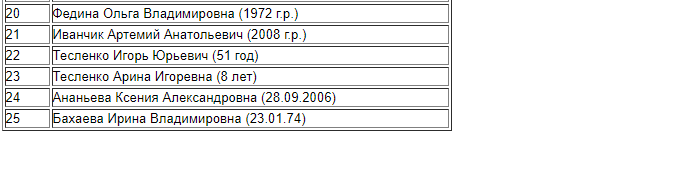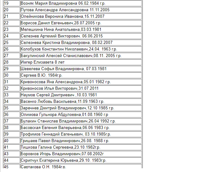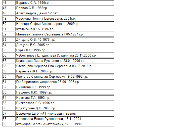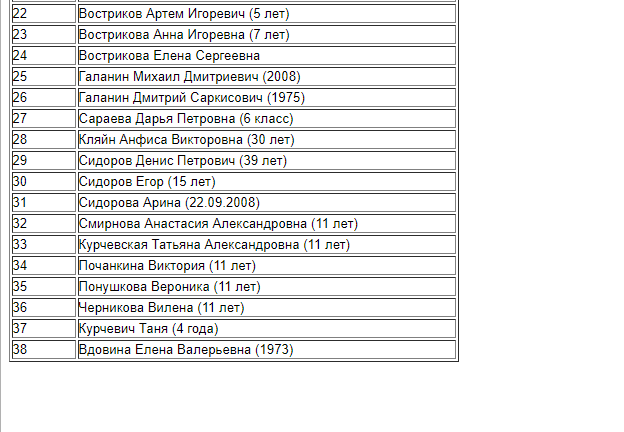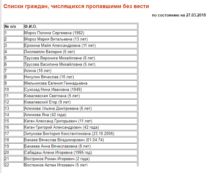 В списке пропавших 38 человек, в том числе 26 детей, даты рождения двух человек не указаны.