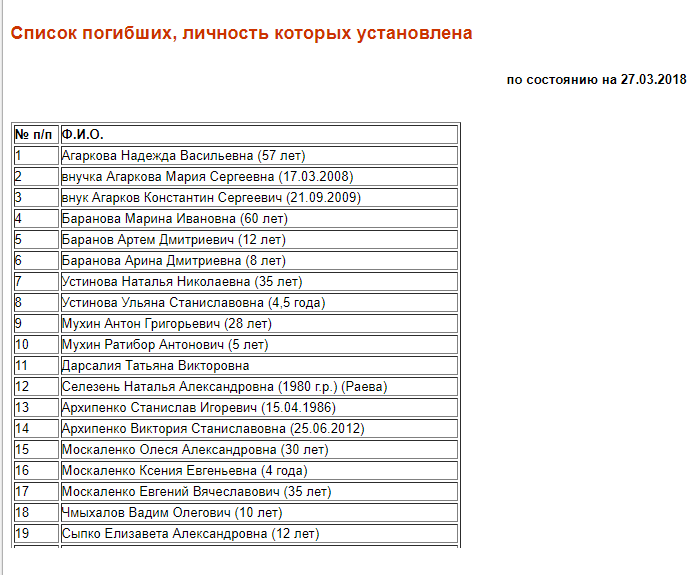 Опубликован список погибших и пропавших без вести при пожаре в Кемерово