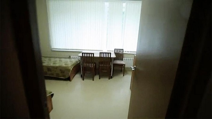 В сюжете отмечается, что обстановка в комнате сейчас гораздо более комфортная, чем раньше. На кадрах видно обстановку комнаты - три кровати, стулья, тумбочки и небольшой плазменный телевизор на стене.