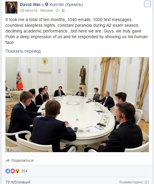 Один из участников встречи - студент Дэвид Вэй - рассказал в Facebook, что на подготовку ушло "десять месяцев, 1040 электронных сообщений, 1000 SMS, бесчисленные бессонные ночи, непрекращающаяся паранойя в период экзаменов, ухудшение успеваемости". "Ребята, мы, действительно, произвели на Путина сильное впечатление, а он в ответ показал нам свое человеческое лицо", - написал он.