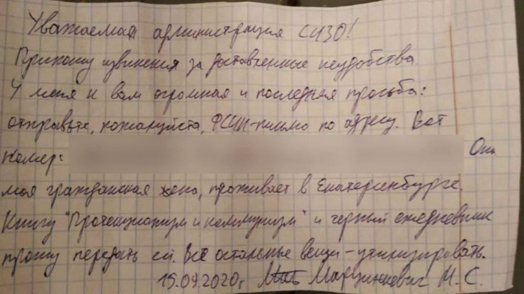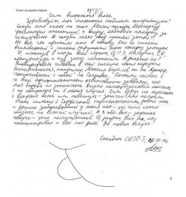 "Если вдруг на пересылке я вскрою вены или повешусь, значит, мне помогли. Очень сильно", - говорится в записке.