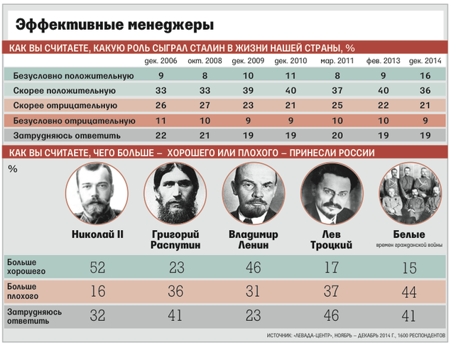 По данным "Левада-центра", положительное отношение россиян к Сталину достигло максимума за все годы опросов. 52 процента опрошенных полагают, что он сыграл в истории страны "безусловно положительную" или "скорее положительную" роль, у 30 процентов - противоположное мнение. Также 52 процента опрошенных считают, что царь Николай II сделал для России больше хорошего, чем плохого. При этом Владимира Ленина положительно оценивают 36 процента россиян, а Бориса Ельцина - 11 процентов.