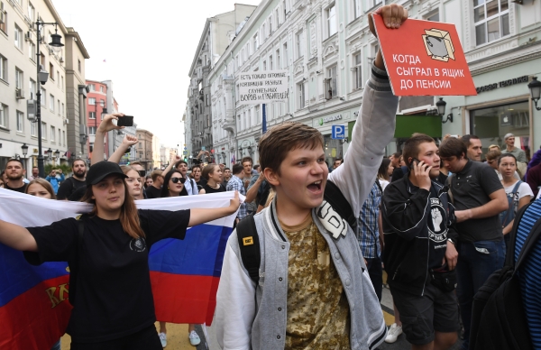 Несогласованная акция против внесения изменений в пенсионное законодательство проходит в центре Москвы в воскресенье.