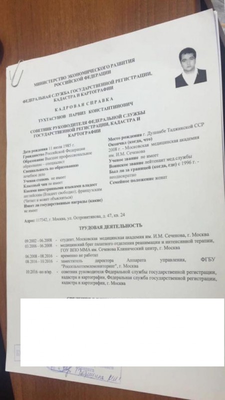 Министр экономического развития РФ Максим Орешкин назначил на должность директора Кадастровой палаты России неизвестного уроженца Таджикской ССР с опытом работы медбратом. На это обратили внимание пользователи портала Pikabu, опубликовавшие фотографии соответствующих документов.