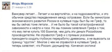 По мнению сенатора, именно Греф, бывший министром экономического развития России в нулевые годы (2000-2007), виновен в том, что страна сейчас находится в полной зависимости от нефти и газа. "Ванкувер летает... Летает и на вертолетах, и на гидросамолетах, и это обычное средство передвижения между островами. Если бы министром экономического развития России в нулевые годы был бы не Греф, то мы бы сейчас тоже летали... И не было бы такой катастрофической зависимости от нефти и газа. Но мы помним заявления Грефа о том, что ему легче купить 100 "Боингов", чем дать эти деньги российским производителям. Не справился Греф и с прямым указанием президента создать глубокую переработку древесины, а не вывозить за границу "кругляк". Многое с чем не справился в нулевые Греф, а теперь заявляет, что Россия - дауншифтер. Безнравственный человек!" - написал Морозов.