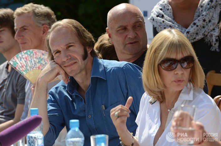 Режиссер Вера Глаголева, актер Александр Балуев и английский актер Рэйф Файнс (справа налево) во время пресс-конференции съемочной группы фильма "Две женщины" в музее-усадьбе М. И. Глинки в селе Новоспасское