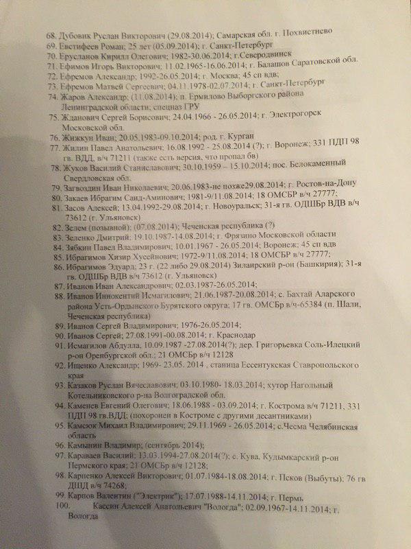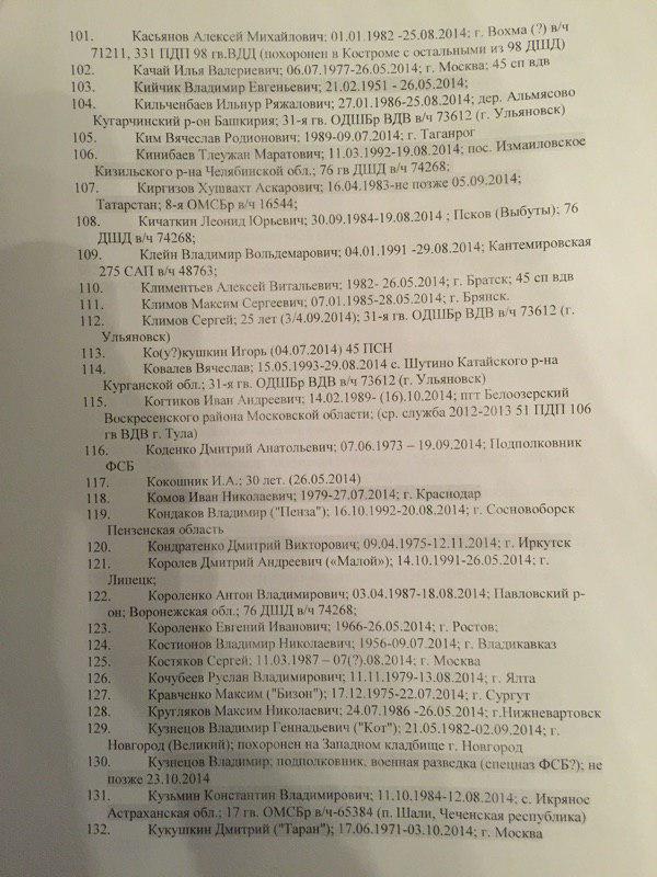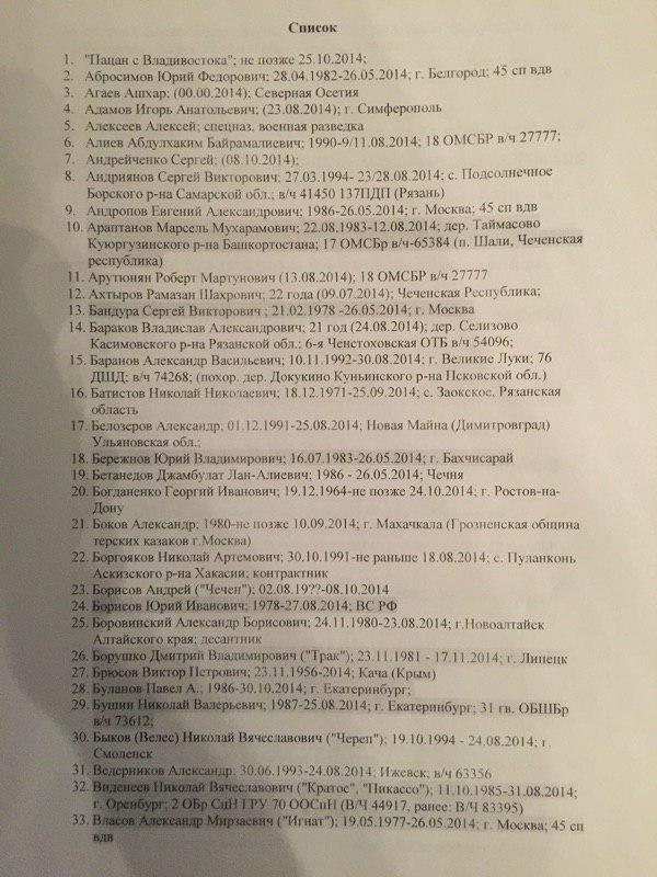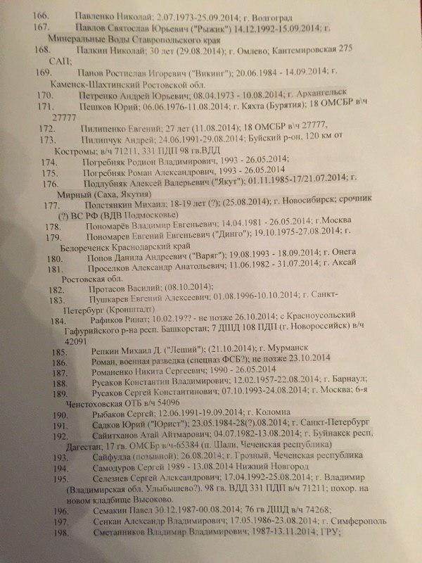 В представленном списке 227 фамилий. При этом сообщается, что "смерть многих людей из списка подтверждается открытыми источниками". Так, по словам специального корреспондента ИД "Коммерсантъ" Ильи Барабанова, который неоднократно ездил в командировки в Донбасс и занимался расследованием смертей россиян на этой войне, "в этом списке очень много знакомых фамилий, некоторые проходили по СМИ и соцсетям".