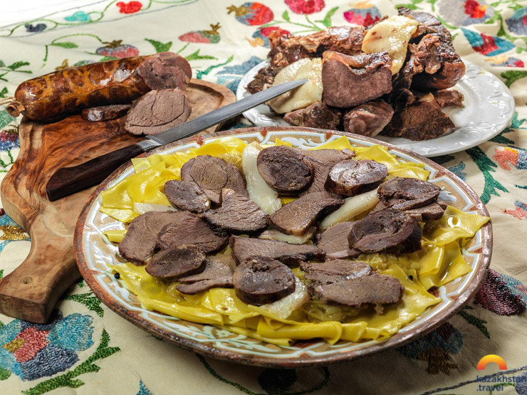 • Известные казахские мясные закуски, украшение любого дастархана, не нужно даже как-либо модернизировать - с оригинальной подачей они и так прекрасно вписываются в меню ресторанов высокой кухни: вяленая конина и баранина, сочные казы с равномерными вкраплениями невероятно нежного и сладкого жирка, отварной говяжий язык и мясо со специями.