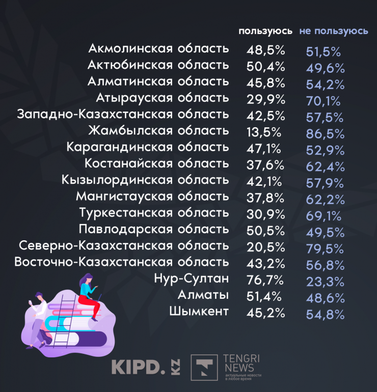 Казахстанцев также спросили, как часто они пользуются электронными приложениями, чтобы получать образовательные услуги. "43 процента, меньше половины опрошенных, пользуются приложениями для получения образовательных услуг. Это онлайн-курсы, языковые, профессиональные курсы. У нас есть регионы-лидеры, которые используют онлайн-услуги, и есть регионы-аутсайдеры. Ожидаемо, что в лидерах у нас находятся Нур-Султан и Алматы. Павлодарская и Актюбинская области тоже в лидерах. Аутсайдеры - это Жамбылская область и СКО: 13,5 процента опрошенных в Жамбылской области и 20,5 процента в СКО ответили, что пользовались электронными приложениями, чтобы получить образовательные услуги", - отметила Регина Аюпова.