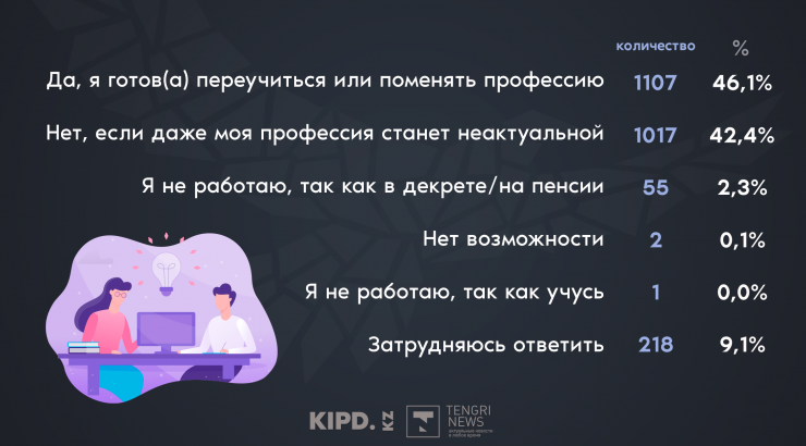 В исследовании также был затронут вопрос относительно того, насколько казахстанцы готовы переучиться и получить новую профессию в связи с развитием новых технологий и автоматизацией на рынке труда.