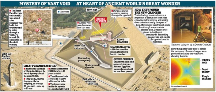 Речь идет об обнаружении "тайной комнаты" неизвестного назначения. Полость длиной около 30 метров нашли участники проекта ScanPyramids с помощью мюонного сканирования. Проникнуть в нее невозможно. Об открытии написал журнал Nature, а также сообщили многие мировые СМИ.
