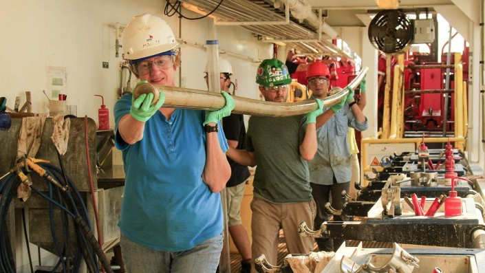 Исследователи несут керн, извлеченный с морского дна с помощью бура. © Clara Blattler
