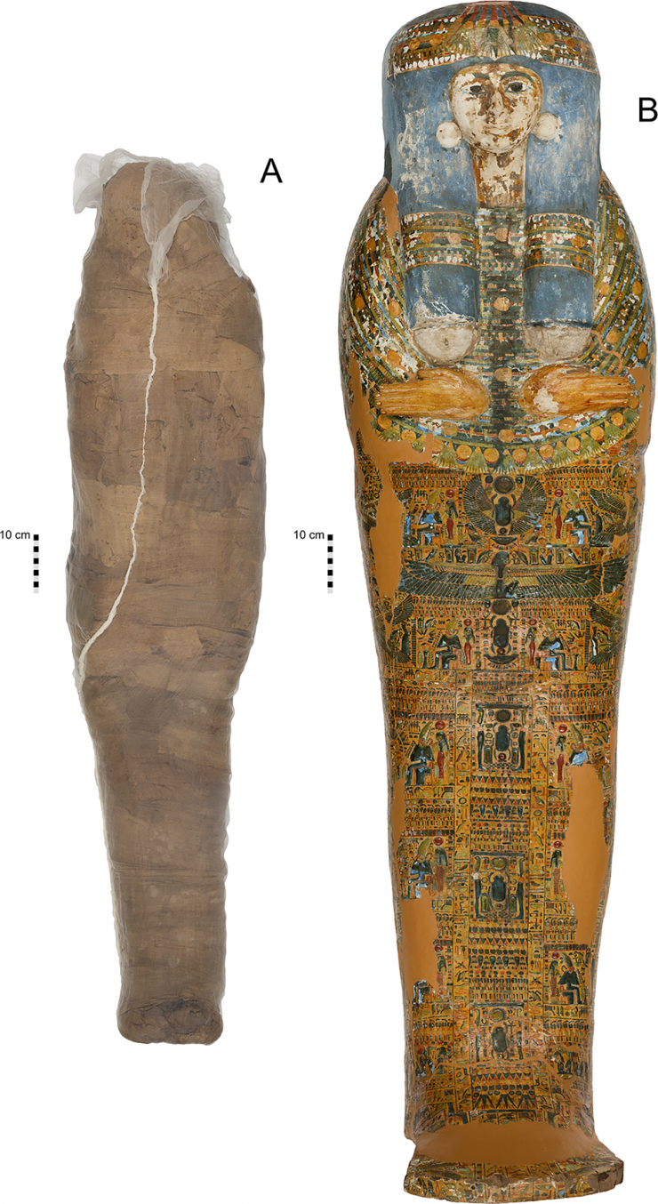 Однако новые исследования с применением современного оборудования показали, что поверх оболочки из глины нанесена роспись, а она сама, возможно, играла роль саркофага. Ученые выяснили, что внутри глиняного саркофага находится женщина в возрасте 26–35 лет, а радиоуглеродное датирование льняной ткани, в которую она была обернута, помещает ее в эпоху позднего Нового царства.