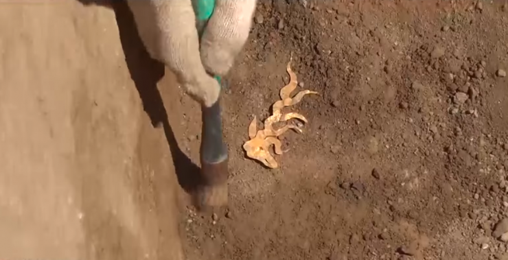 Как выяснилось, захоронение ранее было разграблено. Во время раскопок исследователи нашли человеческие останки и золотые украшения, выполненные в зверином стиле. Диаметр сакского кургана - приблизительно 30 метров.