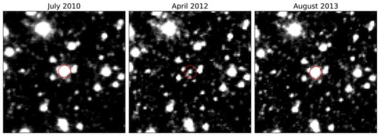 Наблюдая за ней с помощью телескопа Vista в обсерватории Чили, команда ученых заметила, что за несколько сотен дней гигантская звезда, находящаяся на расстоянии 25 тысяч световых лет от Земли, потускнела на 97 процентов, а затем постепенно вернулась к прежней яркости.