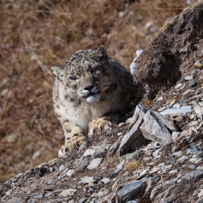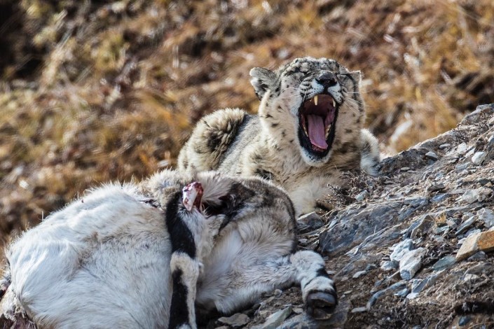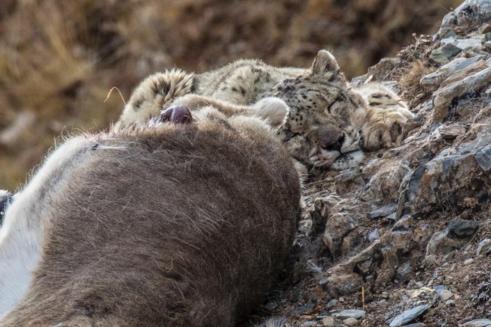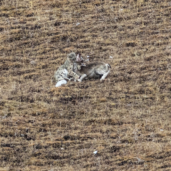 После длительного ожидания фотосессия все же состоялась. При этом снежный барс продемонстрировал свое охотничье мастерство: он не сразу напал на выбранную жертву, а сначала столкнул ее со склона. Баран, проделавший головокружительный путь вниз, оказался дезориентирован и ослаблен, и это сильно облегчило задачу нападавшему.