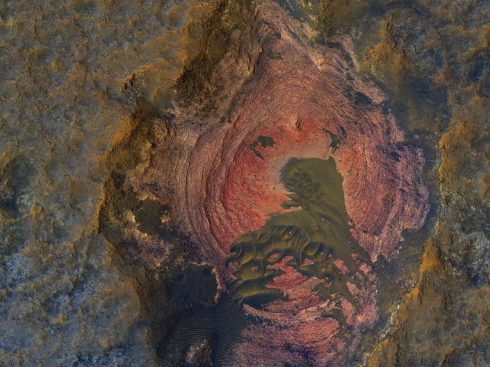 На снимке запечатлен один из "обнаженных" рельефов, частично засыпанный песчаными дюнами. Комментируя изображение, исследователи написали, что им удалось запечатлеть "красноречивое сердце" Марса.