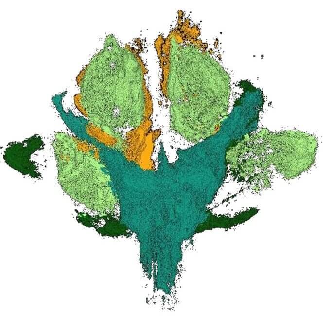 Чтобы лучше разглядеть строение цветка, ученые использовали компьютерную томографию. Проведя растение через специальный аппарат, исследователи слой за слоем рассмотрели все внутренности древней находки. Томографический снимок можно посмотреть ниже: листья растения отмечены темно-зеленым, пестики выделены светло-зеленым, а лепестки - оранжевым цветом.