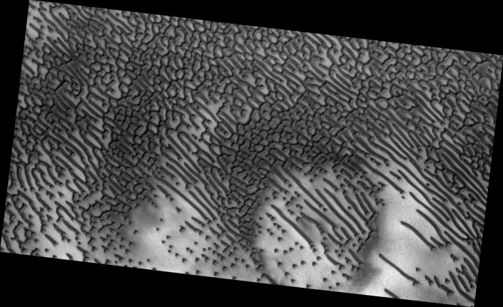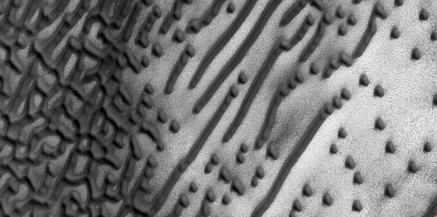 Необычный ландшафт запечатлела на поверхности Марса камера HiRISE, установленная на автоматической межпланетной станции Mars Reconnaissance Orbiter (она фотографирует поверхность небесного тела в ближнем инфракрасном диапазоне и видимом свете). Среди песков Красной планеты специалисты увидели дюны, образующие причудливую серию точек и тире, похожих на азбуку Морзе, передает RT.