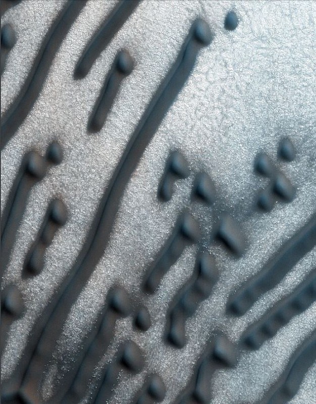 Особенно четко узоры проявились на дюне Хагаль, расположенной южнее северного полюса Марса. Планетолог Вероника Брэй, работающая с камерой Hi-RISE, расшифровала надпись со снимка. У нее получился такой текст: "NEE NED ZB 6TNN DEIBEDH SIEFI EBEEE SSIEI ESEE SEEE!!".