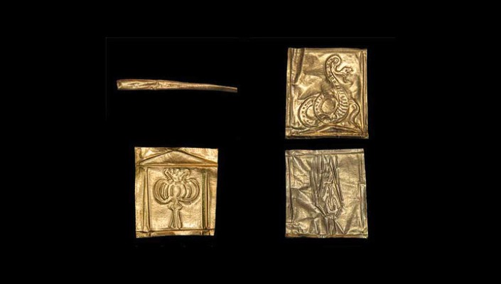 После тщательного изучения содержимого и фильтрации заполнявшей саркофаг жидкости, ученые также обнаружили внутри несколько тонких золотых пластинок размером примерно 5*3 сантиметра, покрытых символическими и вполне реалистичными изображениями.
