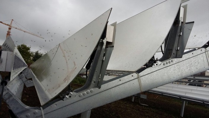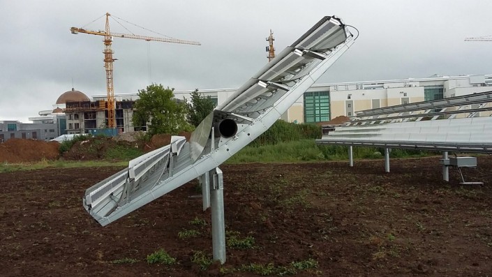 Система состоит из одноосевого трекера (электропривод) и шестирядных сферических зеркал, отражающих свет на кремниевые солнечные элементы, что увеличивает концентрацию солнечного света, за счет чего удваивается производительность системы и соответственно выработка электроэнергии.
