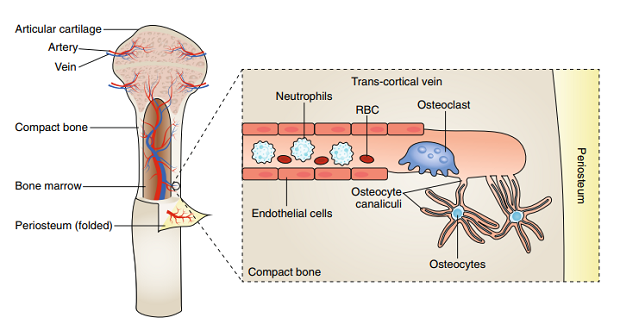 Схема строения транскортикального сосуда, проходящего через компактное вещество длинной кости. © Nature